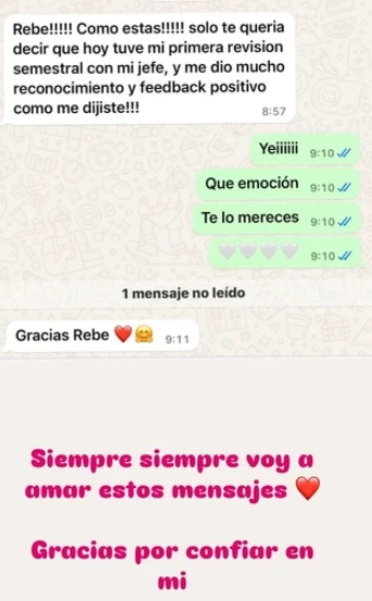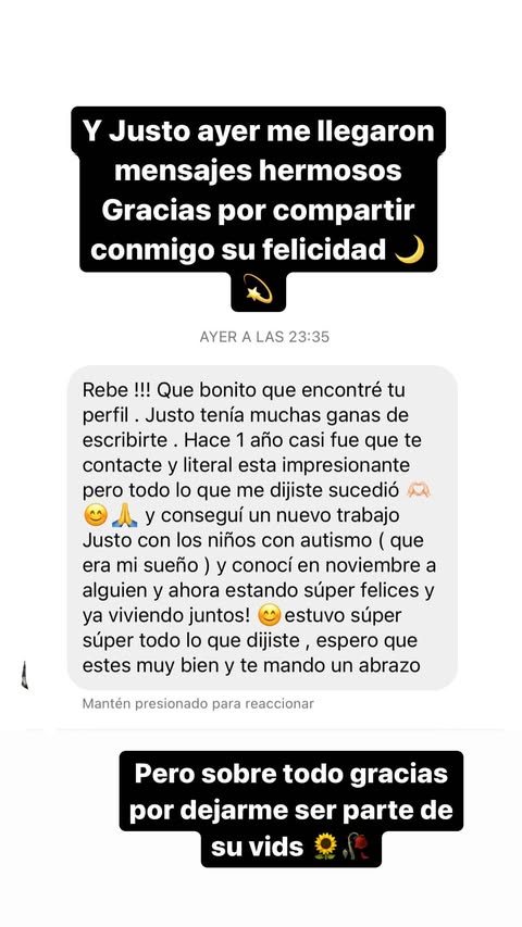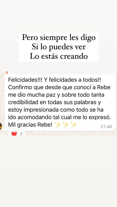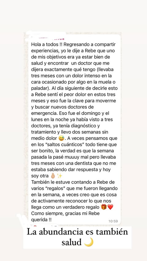 Hola a todos !! Regresando a compartir experiencias, yo le dije a Rebe que uno de mis objetivos era ya estar bien de salud y encontrar un doctor que me dijera exactamente qué tengo (llevaba tres meses con un dolor intenso en la cara ocasionado por algo en la muela o paladar). Al día siguiente de decirle esto a Rebe sentí el peor dolor en estos tres meses y eso fue la clave para moverme y buscar nuevos doctores de emergencia. Eso fue el domingo y el lunes en la noche ya había visto a tres doctores, ya tenía diagnóstico y tratamiento y llevo dos semanas sin medio dolor . A veces pensamos que en los "saltos cuánticos" todo tiene que ser bonito, la verdad es que la semana pasada la pasé muuuy mal pero llevaba tres meses con una dentista que no me estaba sabiendo dar respuesta y hoy soy otra